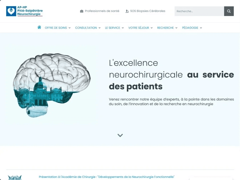 Nous avons collaboré avec le service de neurochirurgie de l’APHP Pitié-Salpêtrière pour créer et maintenir un site web utilisant WordPress et Elementor, avec des mesures de sécurité renforcées et une optimisation SEO.